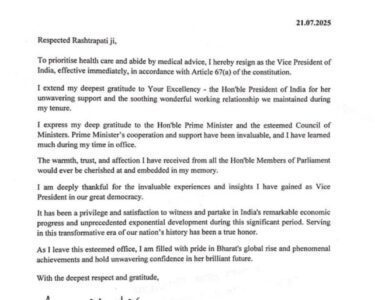 - उपराष्ट्रपति जगदीप धनखड़ ने दिया इस्तीफा,यह वजह आयी सामने..