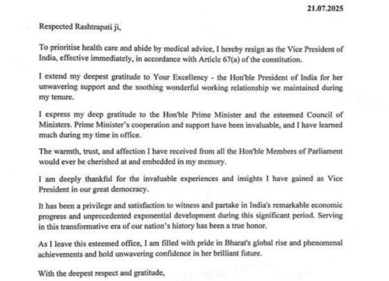 उपराष्ट्रपति जगदीप धनखड़ ने इस्तीफा दे दिया है। धनखड़ ने अपना इस्तीफा राष्ट्रपति द्रौपदी मुर्मू को सौंपा है। अपने…