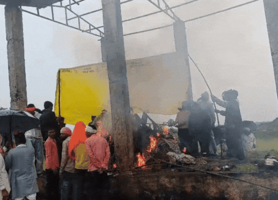 गुना में बारिश में तिरपाल डालकर करना पड़ा अंतिम संस्कार:सांप के काटने से हुई थी बुजुर्ग की मौत; रातभर घर से बाहर खड़ा रहा परिवार